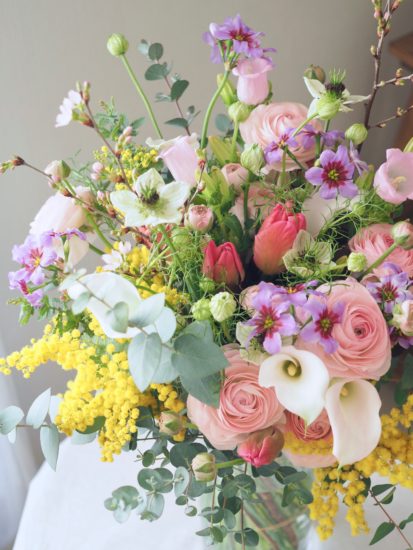 ミモザを入れてふんわりナチュラルにアレンジしたいと思います。